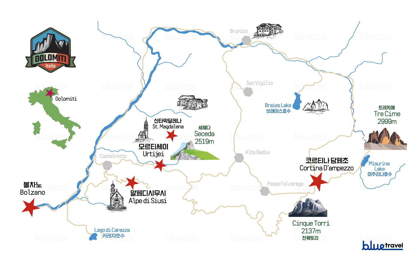 촘촘한 돌로미티 지역의 버스노선 & 블루가 단독으로 진행하는